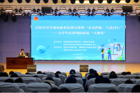 本网讯 为深入贯彻习近平法治思想和习近平总书记关于青年工作的重要思想,全面落实“八五”普法规划要求,切实增强青年大学生的法治意识与风险防范能力,12月12日下午,岳阳市青年创业就业法律宣讲暨“青春护航·与法同行”——大学生法律风险防范“大课堂”活动走进PP电子。300余名学生代表在学术报告厅沉浸式学习法律知识,筑牢成长法治防线。